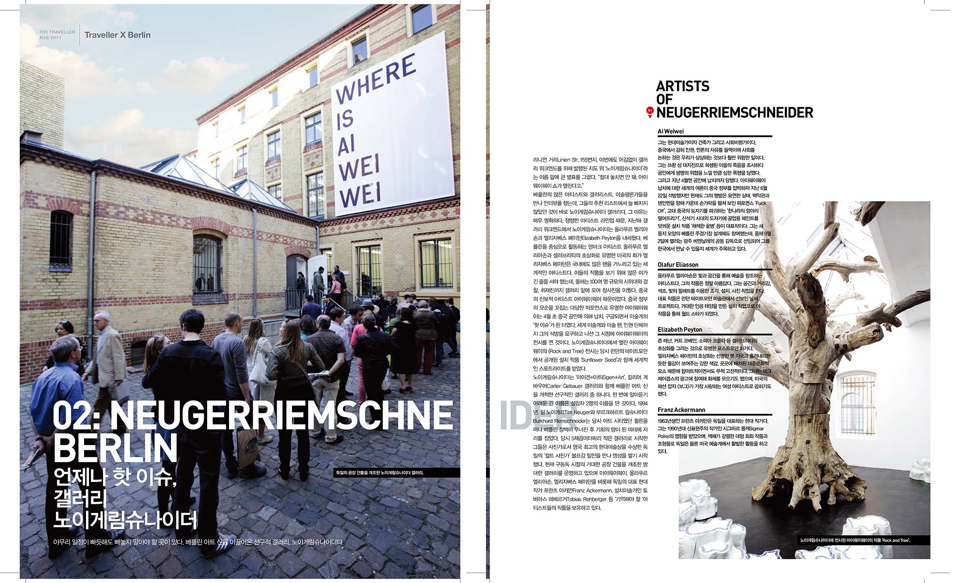 노이게림슈나이더는 ‘아이겐+아트Eigen+Art’, 칼리어 게바우어Carlier Gebauer 갤러리와 함께 베를린 아트 신을 개척한 선구적인 갤러리 중 하나다. 한 번에 알아듣기 어려운 긴 이름은 설립자 2명의 이름을 딴 것이다. 1994년, 팀 노이게르Tim Neuger와 부르크하르트 림슈나이더Burkhard Riemschneider는 당시 아트 시티였던 쾰른을 떠나 베를린 장벽이 무너진 후 기회의 땅이 된 미테에 자리를 잡았다. 당시 5제곱미터짜리 작은 갤러리로 시작한 그들은 사진가로서 영국 최고의 현대미술상을 수상한 독일의 ‘컬트 사진가’ 볼프강 틸만을 만나 명성을 쌓기 시작 했다. 현재 구동독 시절의 거대한 공장 건물을 개조한 방대한 갤러리를 운영하고 있으며 아이웨이웨이, 올라푸르 엘리아손, 엘리자베스 페이턴을 비롯해 독일의 대표 현대 작가 프란츠 아커만Franz Ackermann, 설치미술가인 토 비아스 레베르거Tobias Rehberger 등 ‘기억해야 할’ 아티스트들의 작품을 보유하고 있다.