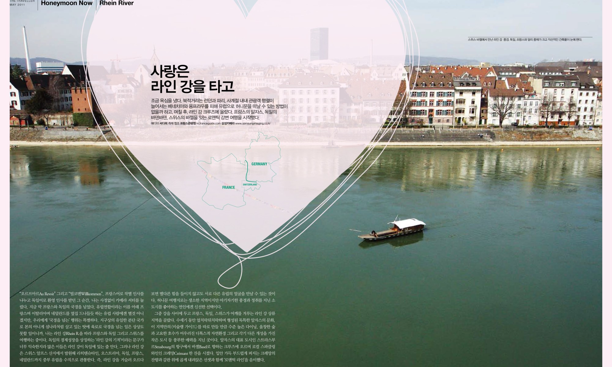 “오르브아르Au revoir” 그리고 “빌코멘Willkommen”. 프랑스어로 작별 인사를 나누고 독일어로 환영 인사를 받던 그 순간, 나는 사정없이 카메라 셔터를 눌렀다. 지금 막 프랑스와 독일의 국경을 넘었다. 유럽연합이라는 이름 아래 프랑스며 이탈리아며 네덜란드를 옆집 드나들듯 하는 유럽 사람에겐 별것 아니겠지만, 우리에게 ‘국경을 넘는’ 행위는 특별하다. 지구상의 유일한 분단 국가 로 본의 아니게 섬 나라 처럼 살고 있는 탓에 육로로 국경을 넘는 일은 상상도 못할 일이니까. 나는 라인 강Rhein R.을 따라 프랑스와 독일 그리고 스위스를 여행하는 중이다. 독일의 경제성장을 상징하는 ‘라인 강의 기적’이라는 문구가 너무 익숙한 지라 많은 이들은 라인강이 독일에 있는 줄 안다. 그러나 라인강은 스위스 알프스 산지에서 발원해 리히텐슈타인, 오스트리아, 독일, 프랑스, 네덜란드까지 중부 유럽을 수직으로 관통한다. 즉, 라인 강을 거슬러 오르다 보면 별다른 힘을 들이지 않고도 서로 다른 유럽의 얼굴을 만날 수 있는 것이다. 허니문 여행지로는 생소한 지역이지만 아기자기한 풍경과 정취를 지닌 소도시를 좋아하는 연인에겐 신선한 선택이다.