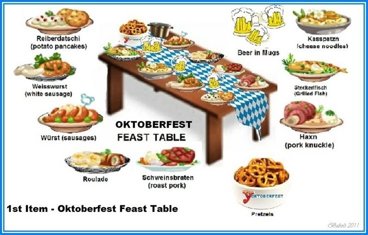 옥토버페스트에 관한 깨알 정보를 제공하고 있는 웹사이트 ‘oktoberfestoktoberfest.com’에서 소개한 옥토버페스트 행사장의 음식이다. 따로 별미를 내세우는 텐트도 있지만, 보통 위에 나열된 바이에른 지방의 전통 음식을 맛볼 수 있다. 그중에서도 가장 전형적인 메뉴들은 다음과 같다.