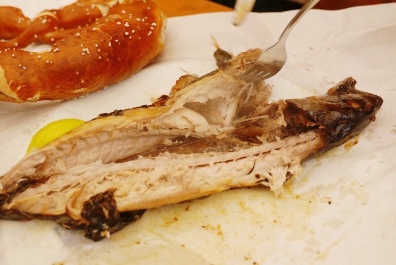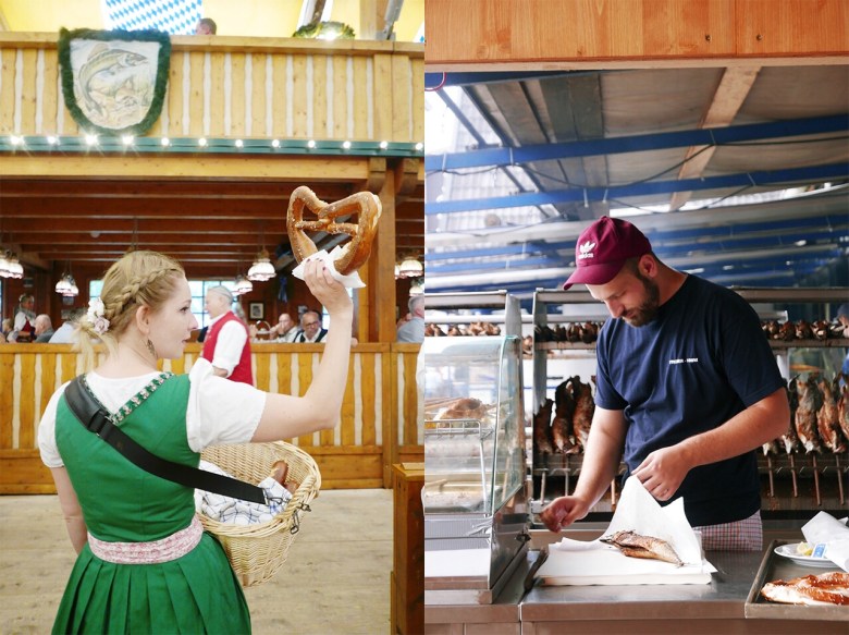 개인적으로 옥토버페스트에서 가장 좋아하는 음식이다. 독일에 살면 한국만큼 맛있는 해산물 요리를 쉽게 먹지 못하는데, 피셔 프로니Fischer Vroni 텐트의 직화로 구운 통생선구이는 정말 맛있다. 잔더(Zander, 농어), 렌케(Renke, 흰송어), 락스포렐레(Lachsforelle, 무지개송어) 등을 아우구스티너 맥주와 함께 즐길 수 있으며 포장도 가능하다. 텐트가 작은 편이라 저녁에는 좌석을 구하기 어려울 수 있으니 낮시간에 찾는 것이 좋다.