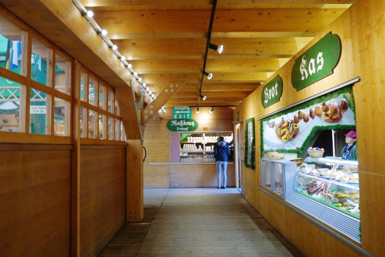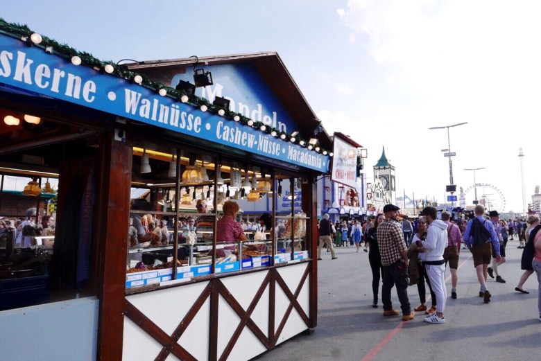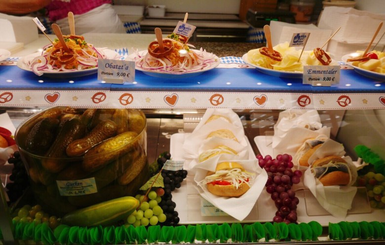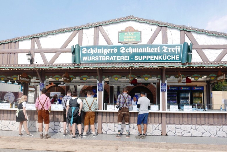 텐트 내에서 판매하는 음식은 비싸다. 하트 모양의 독일 빵 브렛첼 하나에 5.5유로, 구운 치킨 반 마리에 약 11.5유로로 바가지 쓰는 기분이 들게 마련. 텐트 밖의 먹거리들은 한결 저렴하다. 소시지를 끼워 넣은 빵인 브랏부어스트, 감자 튀김인 포메스, 독일식 돼지 족발 요리인 슈바인 학센까지도 마련되어 있다.