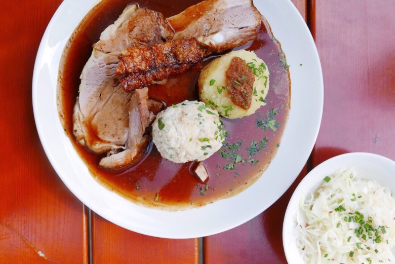 뮌헨의 크래프트비어 브루어리인 기징어 브로이하우스에서 맛본 슈바이네브라튼Schweinebraten이다. 옥토버페스트의 텐트에선 좀 더 캐주얼한 플레이팅을 예상하면 된다. 슈바이네브라튼은 돼지고기(슈바인) 구이(브라트), 즉 로스트 포크로 바이에른을 비롯한 독일 전역은 물론 폴란드, 체코 등에서도 흔히 볼 수 있는 요리다. 독일식 감자 옹심이인(독일식으로 덩치도 큰) 카르토펠크뇌델Kartofelknödel이나 감자샐러드인 카르토펠잘라트Kartofelsalat를 곁들여 먹는다.
