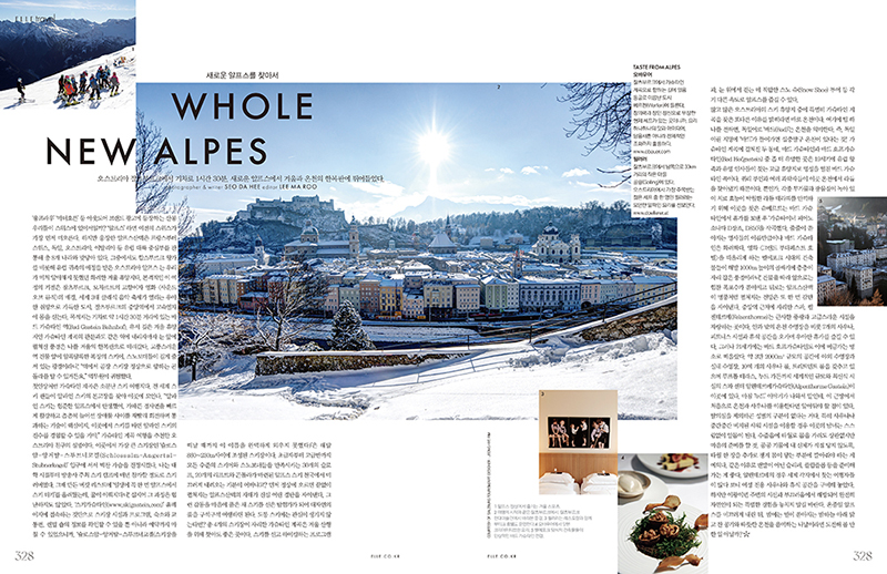 융프라우’ ‘마터호른’ 등 아웃도어 브랜드 광고에 등장하는 산봉우리들이 스위스에 있어서일까? ‘알프스’ 하면 여전히 스위스가 가장 먼저 떠오른다. 하지만 웅장한 알프스산맥은 프랑스부터 스위스, 독일, 오스트리아, 이탈리아 등 유럽 대륙 중심부를 관통해 총 8개 나라와 맞닿아 있다. 그 중에서도 합스부르크 왕가를 비롯해 유럽 귀족의 애정을 받은 오스트리아 알프스는 우리가 미처 알아채지 못했던 화려한 겨울 휴양지다. 본격적인 이 여정의 기점은 잘츠부르크. 모차르트의 고향이자 영화 <사운드 오브 뮤직>의 배경, 세계 3대 클래식 음악 축제가 열리는 우아한 취향으로 가득한 도시, 잘츠부르크의 중앙역에서 고속 열차에 몸을 싣는다. 목적지는 기차로 약 1시간30분거리에 있 는바드 가슈타인 역Bad Gastein Bahnhof. 유서 깊은 겨울 휴양지인 가슈타인 계곡의 관문과도 같은 역에 내리자마자 눈 앞에 펼쳐진 풍경은 나를 겨울의 한복판으로 데려갔다. 고풍스러운 역 건물 앞에 알록달록한 복장의 스키어, 스노보더들이 길게 줄 서 있는 광경이라니! “역에서 곧장 스키장 정상으로 향하는 곤돌라를 탈 수 있거든요.” 역무원이 귀띔했다.