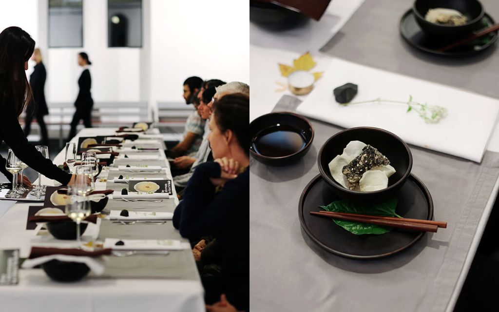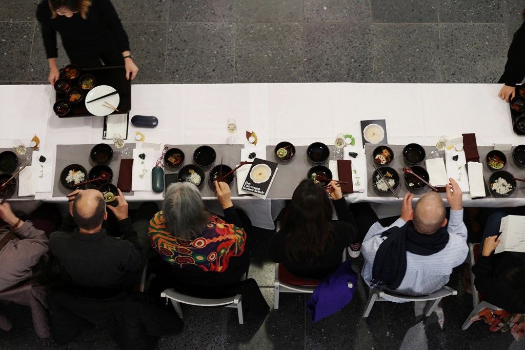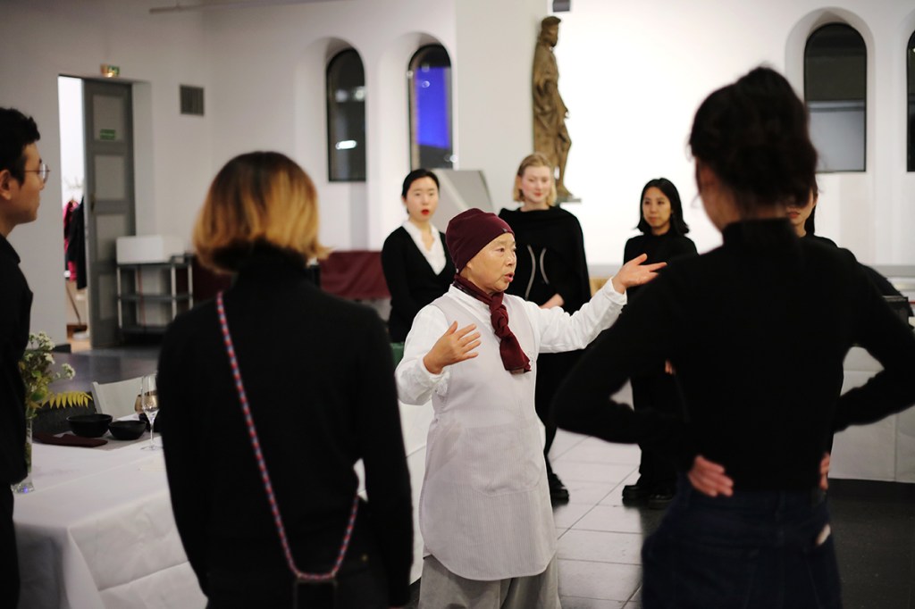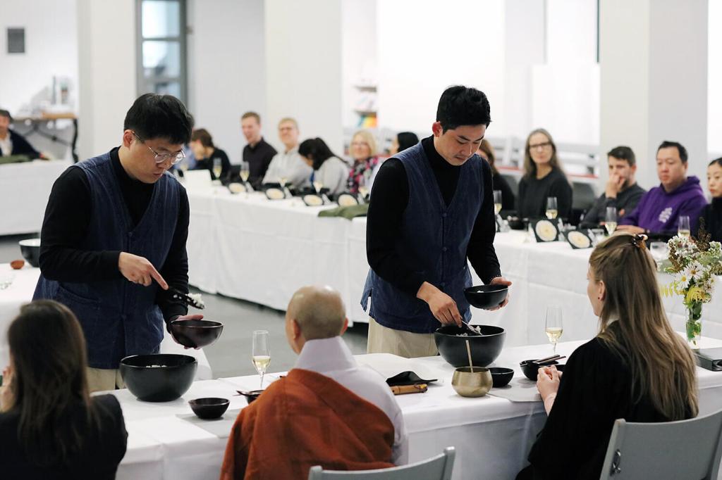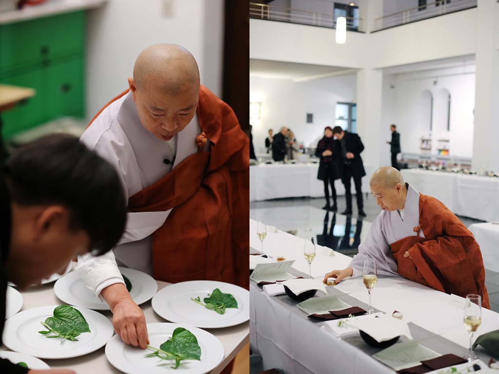 먼 길을 떠나 이번 행사에 참여하게 된 소회를 밝힌 정관 스님. 그는 남북의 자연을 한 그릇에서 음미할 수 있는 메뉴를 준비했다. 금강산 산더덕, 천진암 인근에서 채취한 탱자와 산초, 복분자 등 특별한 식재료를 베를린으로 공수해 유럽식 정찬과 불가의 식사예법이자 수행의 과정인 ‘발우공양’을 통해 선보였다. 이를 맛보기 위해 베를린의 아티스트, 예술 애호가를 비롯해 스타 셰프, 미식 업계 인사, 한식 팬까지 40여명의 다양한 참가자들이 모여들었다. 4가지 종류의 전식과 밥, 국, 7개 반찬으로 구성된 발우공양 한 상, 넷플릭스에 소개된 연꽃차 및 후식이 차례대로 테이블 위에 올려 졌고 곳곳에서 탄성이 흘러나왔다.
