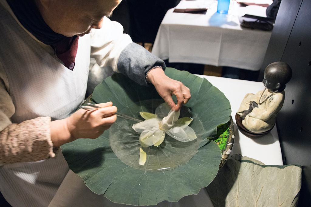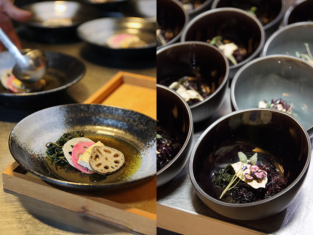 2월 25일과 26일, ‘사찰 음식’은 총 7개 코스 메뉴로 진행됐다. 그중 두 가지는 정관 스님의 요리, 세 가지는 호세 셰프의 요리, 나머지 두 가지는 콜라보레이션 요리로 구성됐다. 음식은 로컬 식재료를 기본으로 하되 장과 말린 나물 등 독일에서 구할 수 없는 한국의 식재료, 천진암에서 만든 김치와 부각, 장아찌 등은 한국에서 공수했다. 한국과 스페인, 독일의 국경을 넘나드는 접시가 테이블에 놓일 때마다 게스트들의 눈이 반짝였다. 3년간 간장에 묵힌 연근, 1년간 숙성시킨 김치, 바삭하고 고소한 김부각과 감자부각, 달콤하고 쫄깃한 감말랭이무침. 쉽게 맛볼 수 없는 식재료인데다 현대적 감각까지 더한 음식은 감탄을 자아냈다. 하이라이트는 ‘발우공양’이었다. 스님들이 사용하는 식기인 발우에 밥과 된장국, 김치와 세 가지 반찬을 담은 한상 차림에 뜨거운 반응이 쏟아졌다. 정관 스님의 사찰 음식은 오신채(불교에서 금하는 다섯 가지 음식으로 파, 마늘, 달래, 부추, 무릇)를 쓰지 않고도 깊은 맛이 우러나온다. 와, 어떻게?