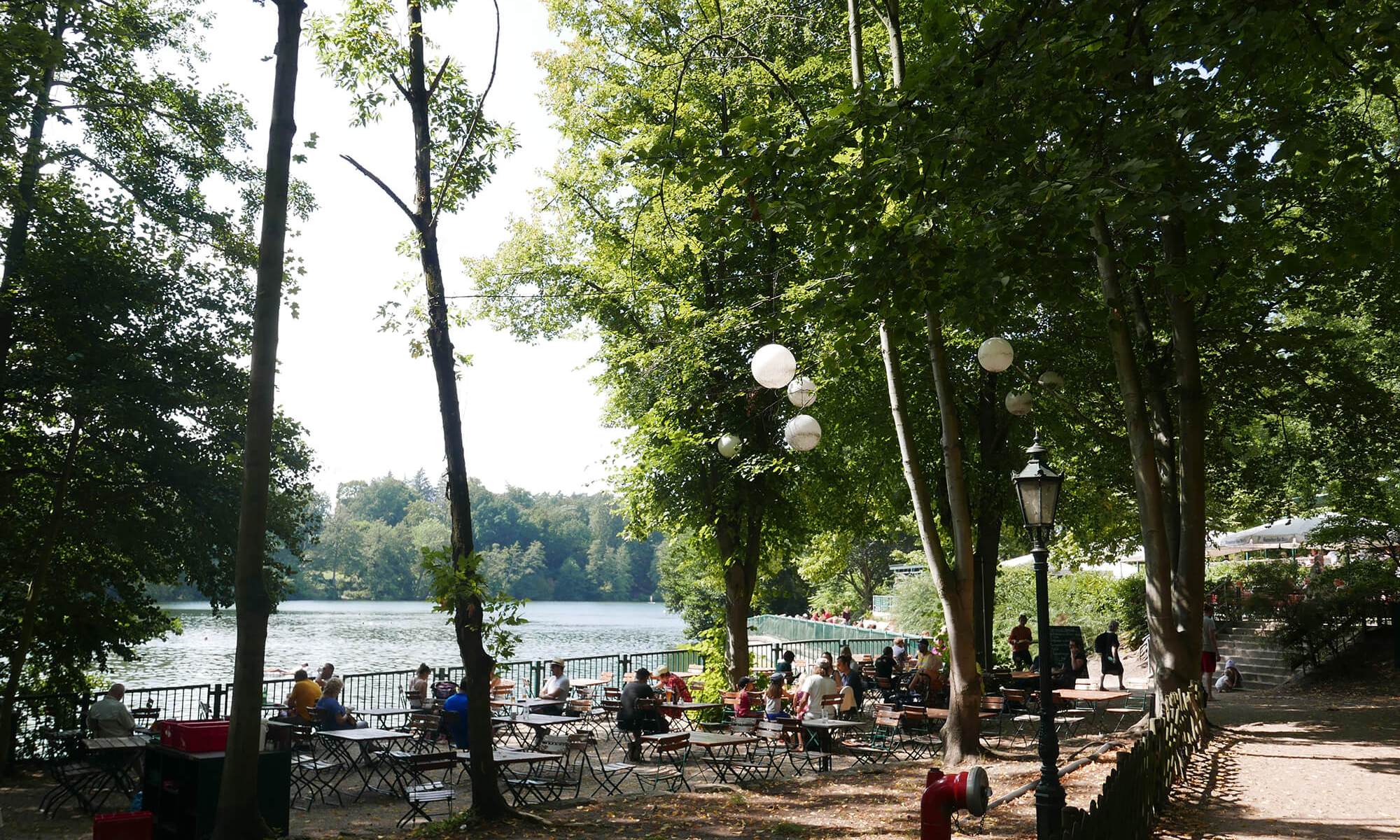 둘째, 근사한 비어가든이 있다. 눈 앞에 호수의 풍경이 펼쳐지는데다 대형 양조장 중 최고로 손꼽히는 아우구스티너 생맥주가 있는 그런 비어가든 말이다. 비어가든은 술과 음식 뿐만 아니라 화장실도 갖추고 있다. 이 때문에 나는 S반(전철) ‘슐라흐텐제 역’이 아닌 ‘멕시코플라츠’역에 내린다. 여기서 세번째 이유. 호수 가는 길에 아기자기한 볼거리가 있다. 먼저 멕시코플라츠의 귀여운 과일 가게를 구경하다 지금 한창 맛있는 납작복숭아와 체리를, 키오스크에서 물 한병 챙긴다. 주말이면 역 앞에 장이 선다. 이곳에서 중동식 메째, 치즈 등 간단한 먹거리를 구입할 수 있다. 맞은편 주택가로 향하면 빵집과 가게, 서점이 있는데 베를린이 아닌 여유로운 시골 동네를 여행하는 기분이 든다. 슬슬 둘러보다 오솔길을 따라 예쁜 전원 주택들을 구경하며 걷다보면 어느덧 슐라흐텐제의 입구가 나타나고, 오른쪽으로 레스토랑이자 비어가든인 ‘피셔휘테 암 슐라흐텐제Die Fischerhütte am Schlachtensee’가 보인다.