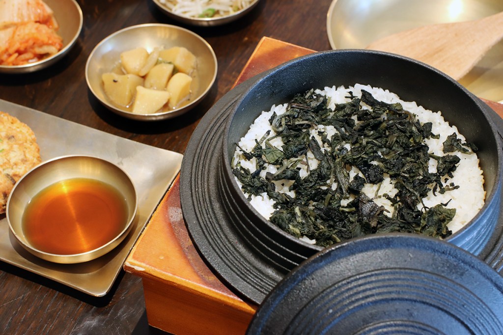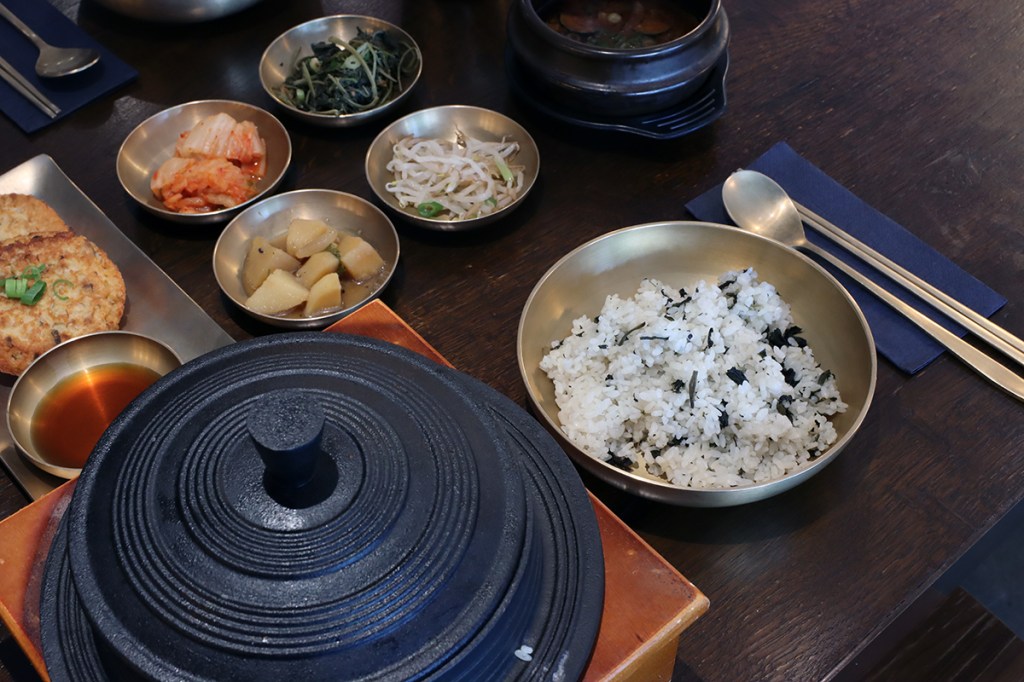 Koreaner lieben den Klebreis. Er wurde immer Suppe auf dem Tisch serviert, damit der Reis reibungslos in den Hals gelangen kannn. Außerdem habe ich einen gusseisernen Kessel mit einem dicken Boden und einem schweren Deckel hergestellt, um den Reis fülliger und glänzender zu machen. Und Sie können eine Vielzahl von gekochtem Reis mit verschiedenen Gemüsesorten essen.