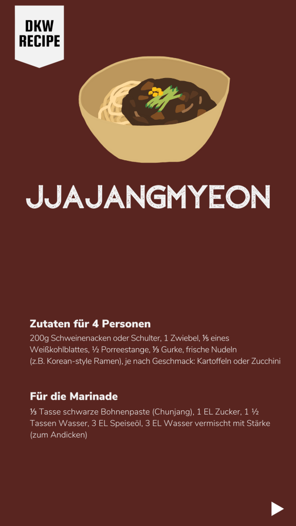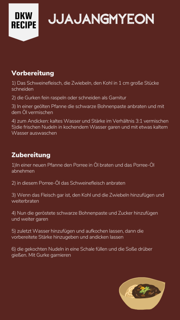 „Jajangmyeon“ ist für die Koreaner:innen das, was der Döner für uns in Deutschland ist. Jajangmyeon basiert auf einem Rezept aus der chinesischen Küche (炸醬麵, Zha jiang mian),welches von in Korea lebenden chinesischen Immigrant:innen eingeführt und an den koreanischen Gaumen angepasst wurde. Im chinesischen Originalrezept wird gehacktes Schweinefleisch mit chinesischer fermentierter Sojabohnenpaste vermischt in Öl angebraten und auf Nudeln angerichtet. In der koreanischen Version ist die Soße aus schwarzer, süßlicher Sojabohnenpaste und wird karamellisiert. Darüber hinaus wird mehr Gemüse wie Chinakohl, Zwiebeln etc. verwendet.