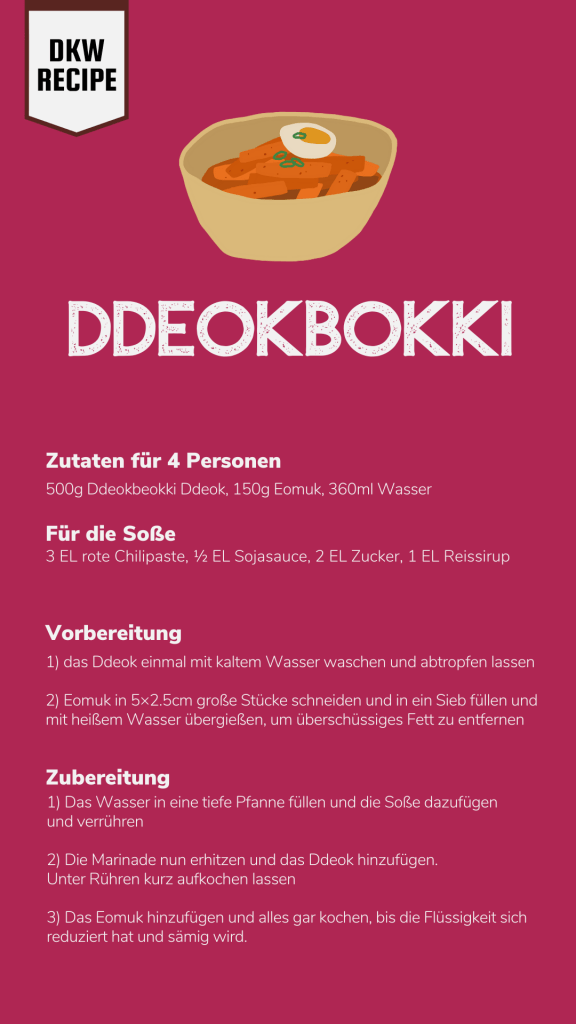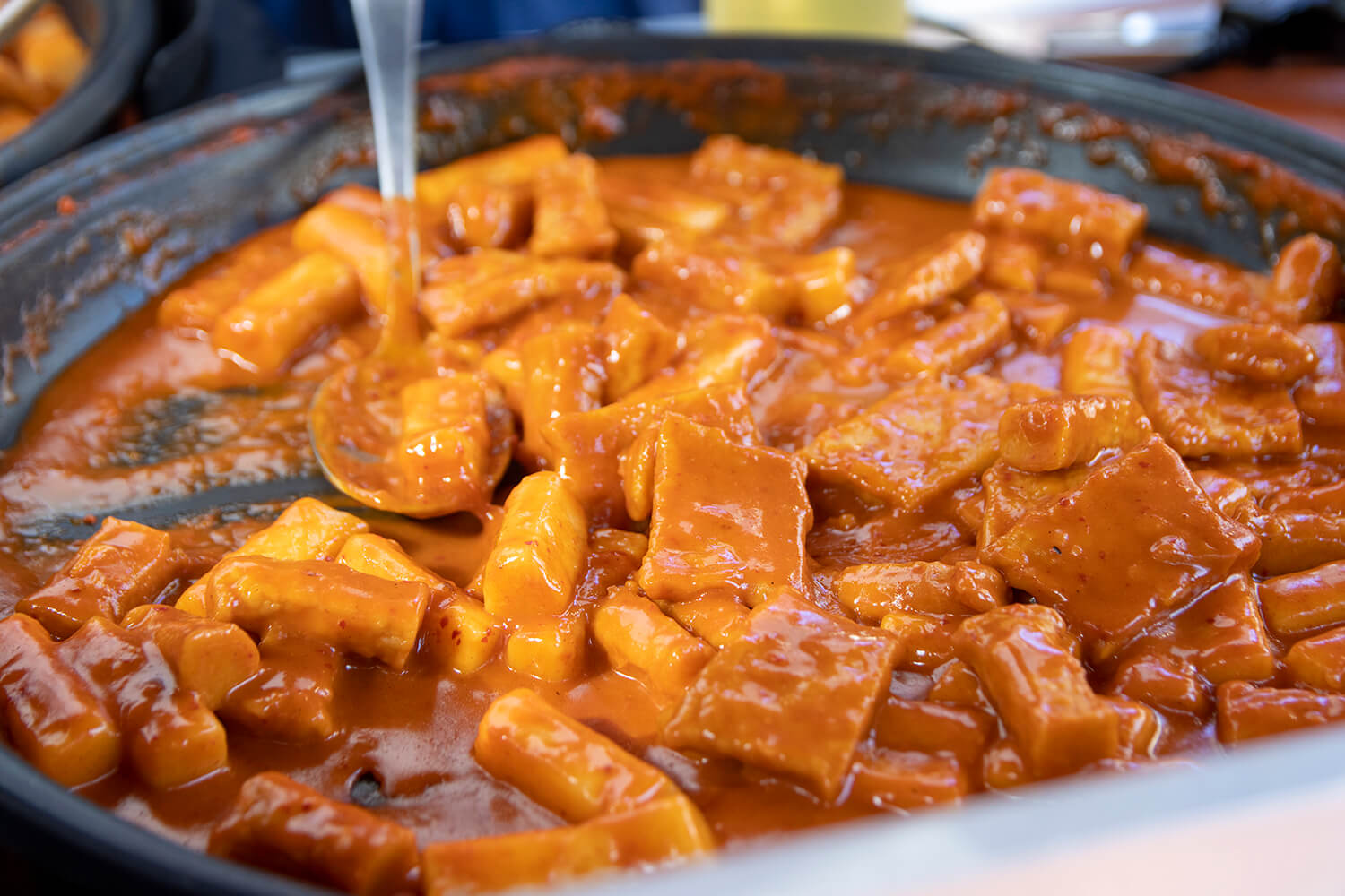 Ddeokbokki ist eine fantastische Kombination aus bissfestem, weißem Ddeok (Reiskuchen) und süßscharfer Soße, die aus roter Chilipaste, Sojasauce, Reissirup, Knoblauch und Frühlingszwiebeln besteht. Zur Zeit der Joseon-Dynastie war Ddeokbokki eine besondere Speise aus der Palastküche. Beim „Palast-Ddeokbokki“ wird anstelle der Chilipaste die Soße aus Sesamöl, Sojasauce und Sesamsalz hergestellt.