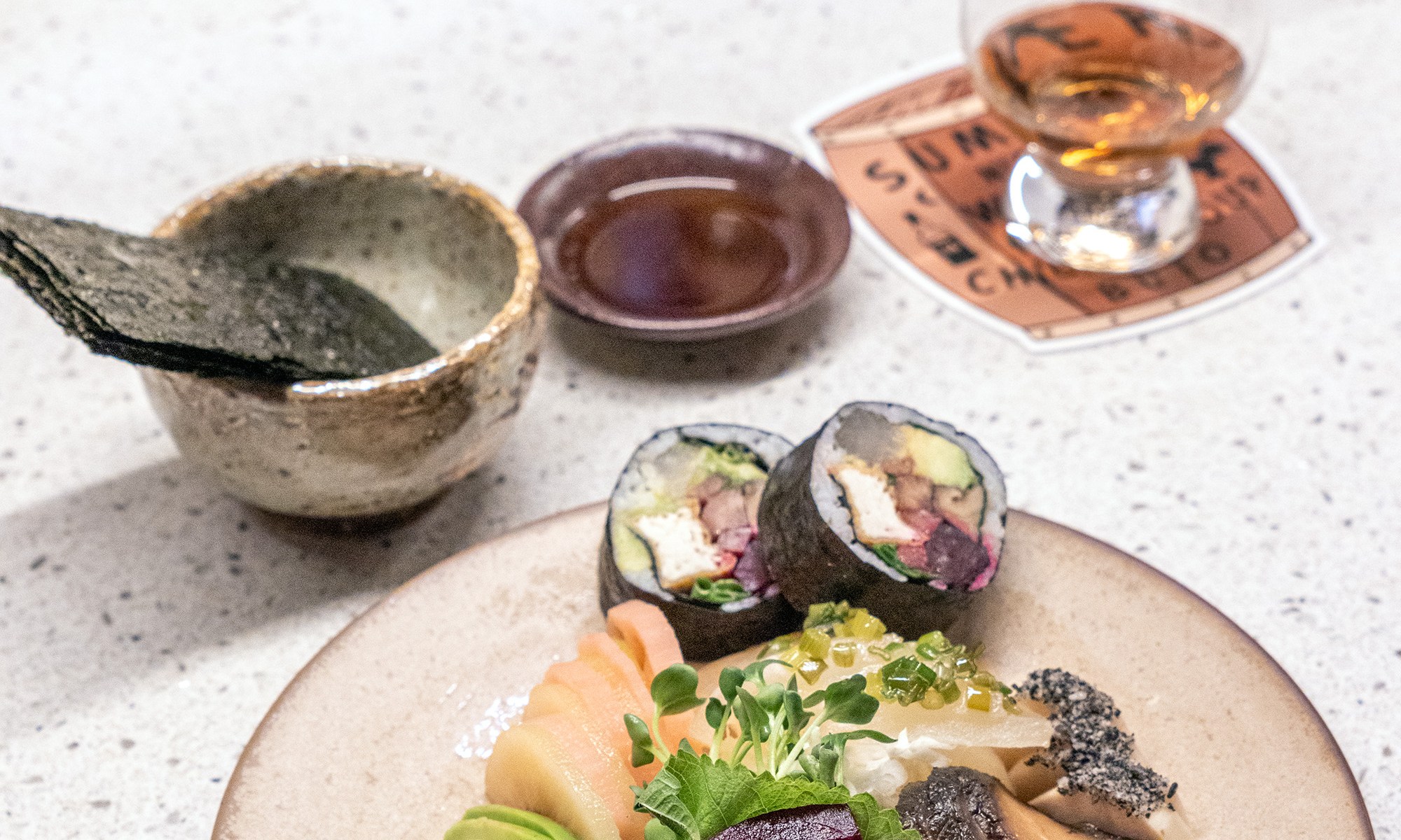 8월 한달 동안 맛볼 수 있는 발베니와의 페어링 메뉴는 부토의 대표 메뉴로 자리잡은 베지테리언 사시미를 비롯해 누룽지 삼계죽&백김치, 수제 꽈배기 아이스크림&금귤정과. 여기에 발베니 프렌치 오크 16년 매칭합니다. 상상이 잘 안가는 조합이라 궁금해서 달려갔는데, 놀랍게도 너무 잘 어울려서 깜짝 놀랐어요.