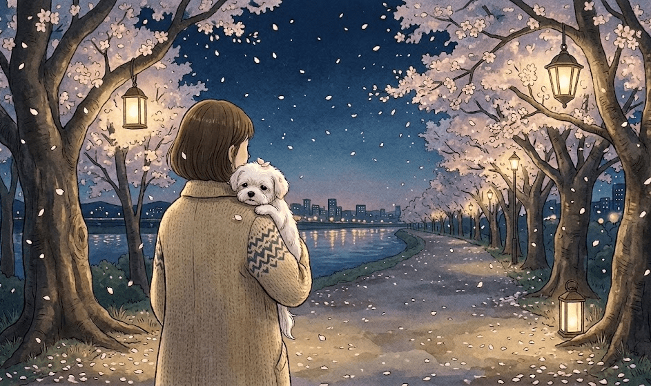 그러다 꽃잎이 거센 바람에 흩날리며 우수수 떨어지던 마지막 날 밤. 아, 그제야 부랴부랴 반려견 호두를 품에 안고 밖으로 나섰다.